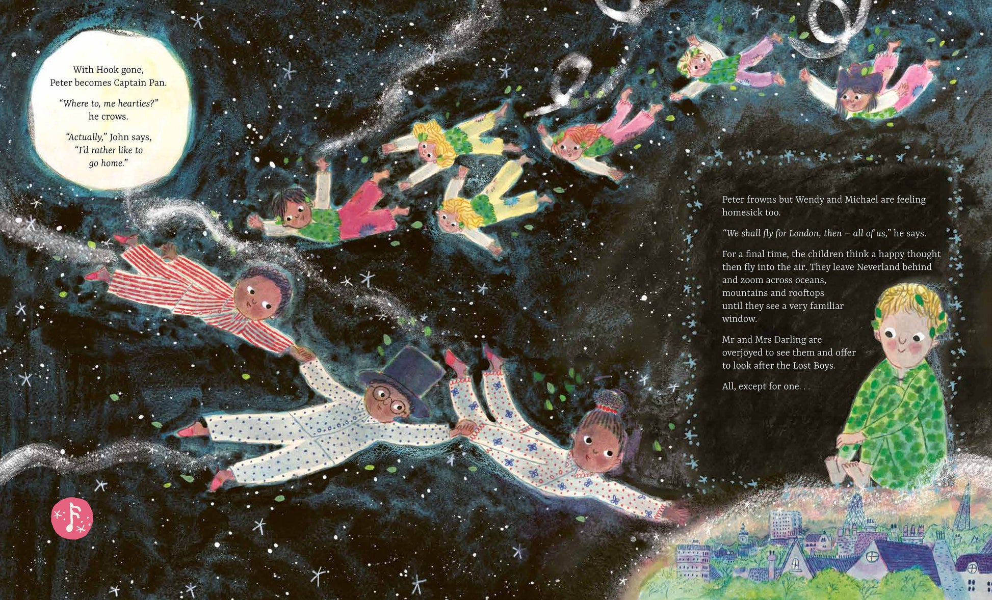 This charming novelty format for young readers ages 3+ features: -A fresh retelling of Peter, Wendy, Michael and John's journey to Neverland, where pirates sail the seas and children never grow up -Classical music on every page to accompany the story - simply press the musical note to hear Chopin, Wagner, Debussy and many more -Stunning new illustrations that bring the well-loved scenes to life -An impressive three tier pop-out stage at the e