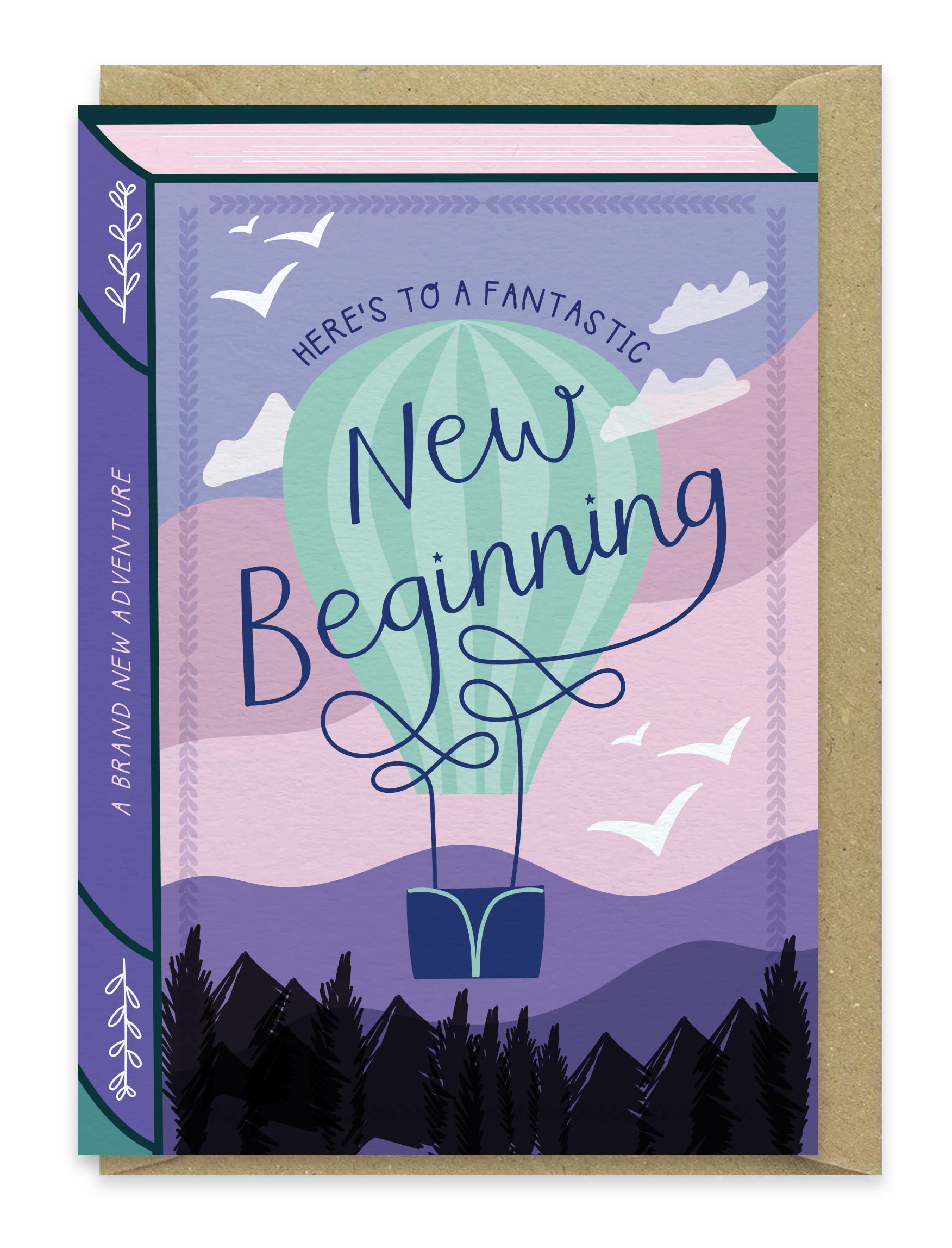Inspired by the beauty of classic book covers, this book style greeting card features a Book cover design of a hot air balloon rising into a beautiful mountain sunrise. The book title greeting reads ‘Here’s to a fantastic New Beginning’ and is brilliant for sending good luck vibes for someone perhaps moving away, getting a new job, switching careers, going to university, and many more occasions.